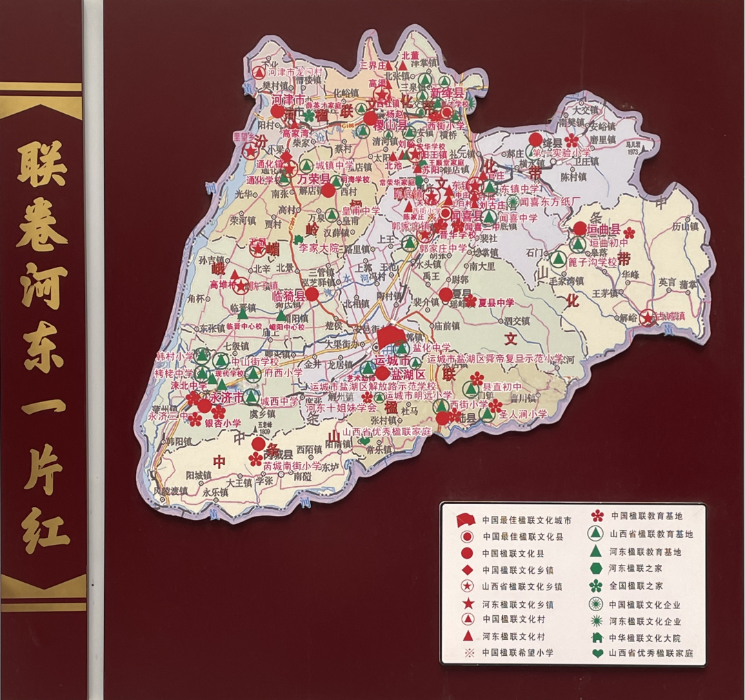 · 中国楹联学会顾问 运城市楹联学会顾问委员会主任 岳民立25年来,我们搞了三百多次(活动),比较印象深的几次活动是2006年的10月,在运城被评为“中国十大魅力城市”的时候,我们在全国征回市联1300副,经过专家和群众投票评审,最后确定了10副市联,这10副市联就成了运城的名片。再一个就是2017年11月,随着绛县、平陆、芮城被中国楹联学会评为“中国楹联文化县”,在运城13个县、市、区实现了“联卷河东一片红”,我很激动、很感慨。 2006年征回的十副市联展示
