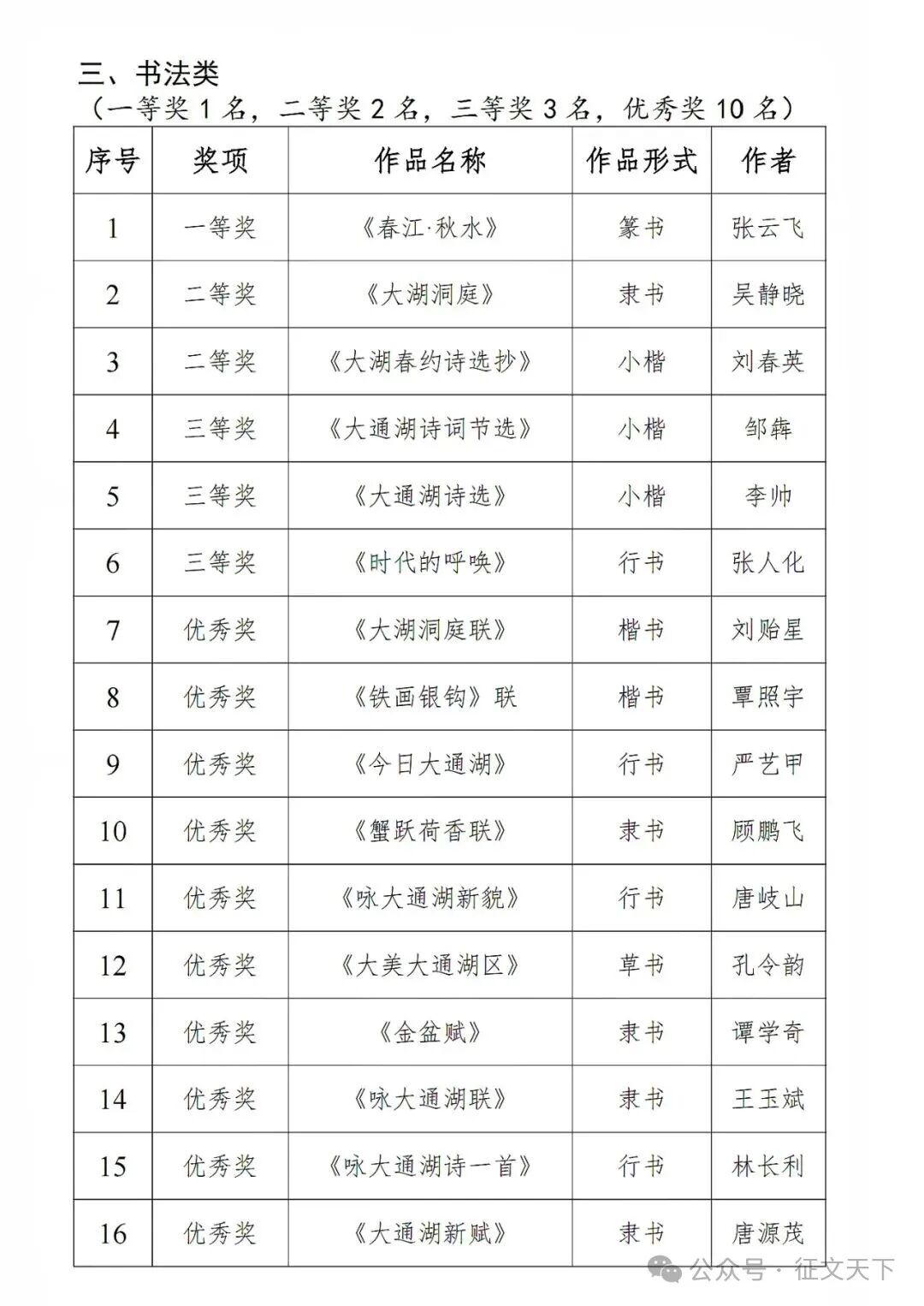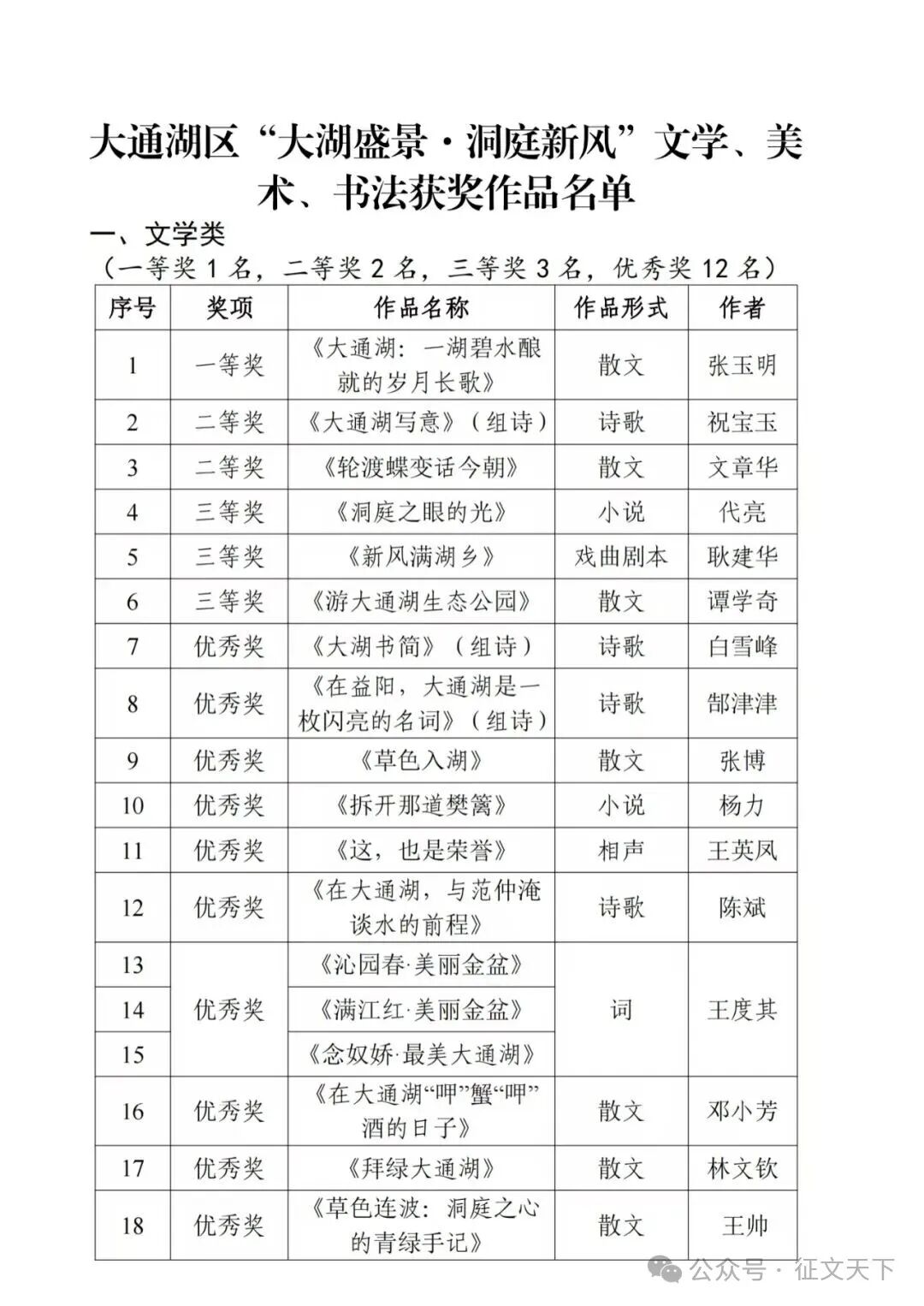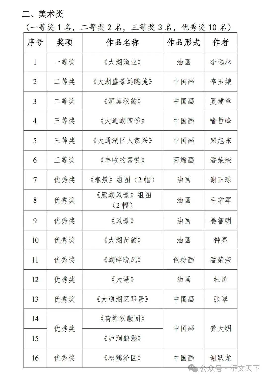 为庆祝中华人民共和国成立76周年,充分展现大通湖区改革发展新成就、社会进步新风貌,2025年6月至9月,我部面向全社会组织举办了“大湖盛景·洞庭新风”文学、美术、书法作品征集活动。经专家评审委员会评审,最终评选出获奖作品共50个,其中一等奖作品3个(文学、美术、书法类各1个)、二等奖作品6个(文学、美术、书法类各2个)、三等奖作品9个(文学、美术、书法类各3个)、优秀奖作品32个(文学类12个、美术类10个、书法类10个)。