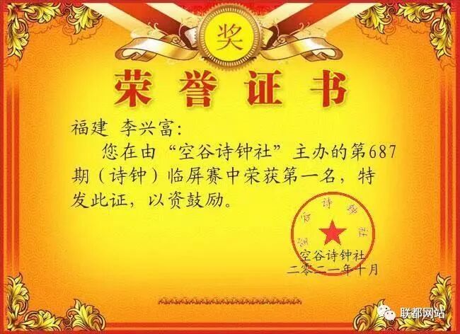 即日起,凡各期“空谷诗钟社”临屏赛获得第一名者,以及累计进入十佳3次及以上者,如果本人愿意,可由联都负责推荐加入中国楹联学会;符合条件的联友,请和吴海燕联系;入会后,将获免费赠送全年《中国楹联报》。