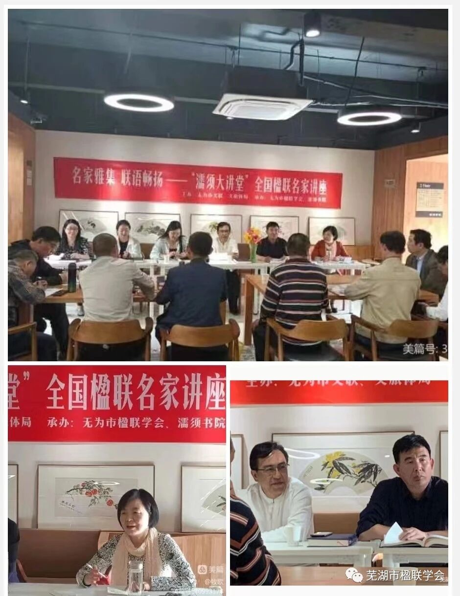▲第二天上午,参观了芜湖古城,湾沚区楹联文化主题公园--东湖公园,并在琵琶岛东湖书院合影留念。下午 2:00赴无为市楹联学会考察交流。 ▲名家雅集 联语畅扬——“濡须大讲堂”全国楹联名家讲座在濡须书院召开。座谈会由无为市楹联学会会长鲁传霞主持,市文联副主席胡春雷致欢迎词,学会秘书长汪大木介绍了无为楹联文化的发展和无为楹联类书籍的编撰情况。辽宁联家宋少强先生就楹联创作需注重“雅、润、活、新”做了精彩阐述,河北联家白国成先生就征联话题发表了独到见解,应绿霞、承洁、汪滢等联家先后作了交流发言。芜湖市楹联学会陶能林、孔军、张双柱、祝云书、谭大用等也纷纷发言,无为市部分联友就楹联创作方面的疑问或困惑与联家们进行互动交流。会场气氛热烈,与会者表示启发很大,收获很多,拓展了创作思路,坚定了创作信心!
