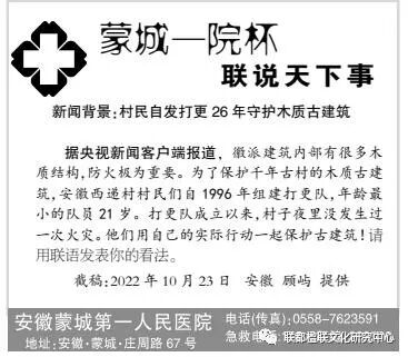 据央视新闻客户端报道,徽派建筑内部有很多木质结构,防火极为重要。为了保护千年古村的木质古建筑,安徽西递村村民们自1996年组建打更队,年龄最小的队员21岁。打更队成立以来,村子夜里没发生过一次火灾。他们用自己的实际行动一起保护古建筑!请用联语发表你的看法。