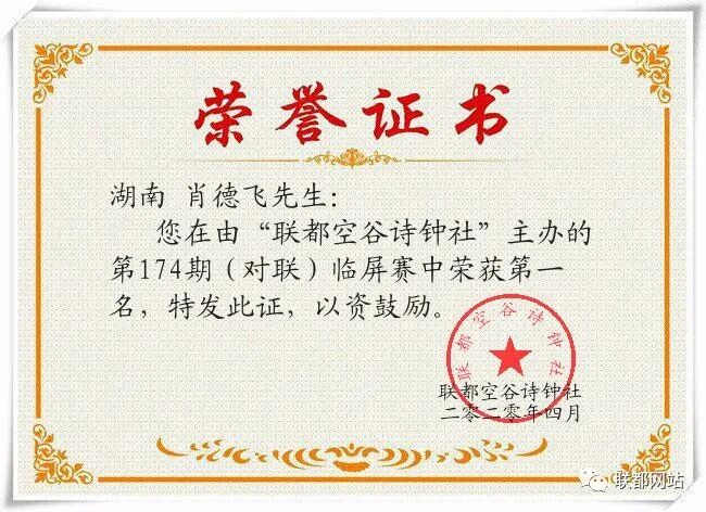 “联都空谷诗钟社”第174期(对联)临屏赛结果公布