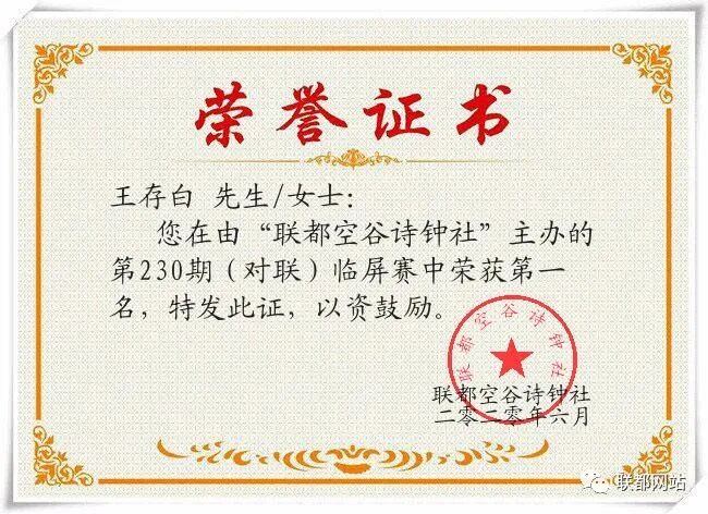 “联都空谷诗钟社”第230期(对联)临屏赛结果公布