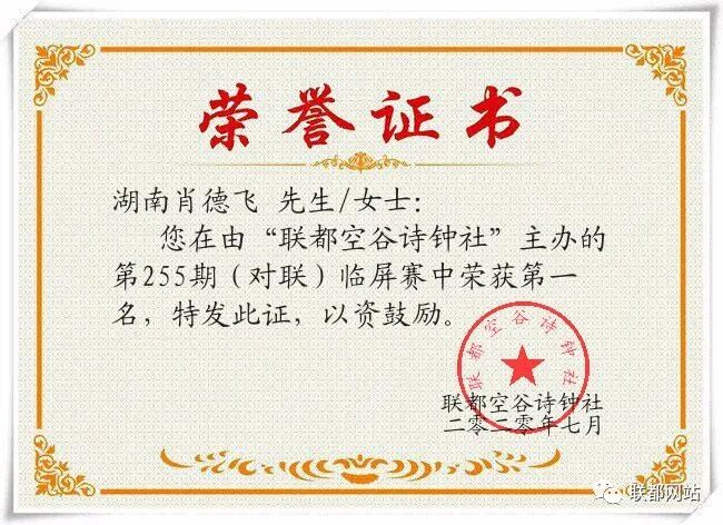 “联都空谷诗钟社”第255期(对联)临屏赛结果公布