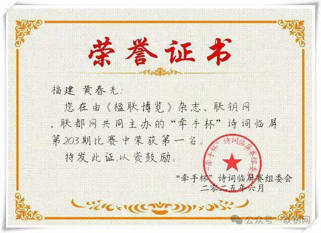即日起,凡各期“牵手杯”诗词临屏赛获得第一名者,以及累计进入十佳3次及以上者,如果本人愿意,可由联都网、联钥网共同负责推荐加入中国楹联学会;符合条件的联友,请和潇湘妃子(微信:clr18687299660)联系;入会后,将获免费赠送全年《楹联博览》。