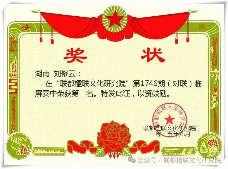 “联都楹联文化研究院”第1746期(对联)临屏赛结果公布