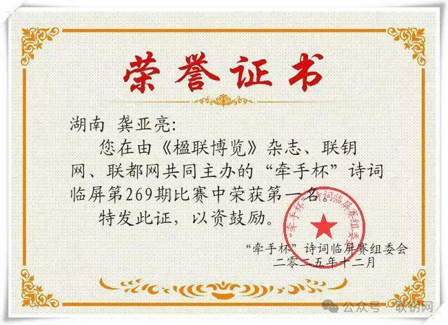 即日起,凡各期“牵手杯”诗词临屏赛获得第一名者,以及累计进入十佳3次及以上者,如果本人愿意,可由联都网、联钥网共同负责推荐加入中国楹联学会;符合条件的联友,请和潇湘妃子(微信:clr18687299660)联系;入会后,将获免费赠送全年《楹联博览》。