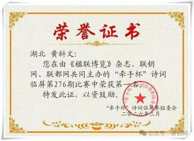 即日起,凡各期“牵手杯”诗词临屏赛获得第一名者,以及累计进入十佳3次及以上者,如果本人愿意,可由联都网、联钥网共同负责推荐加入中国楹联学会;符合条件的联友,请和潇湘妃子(微信:clr18687299660)联系;入会后,将获免费赠送全年《楹联博览》。