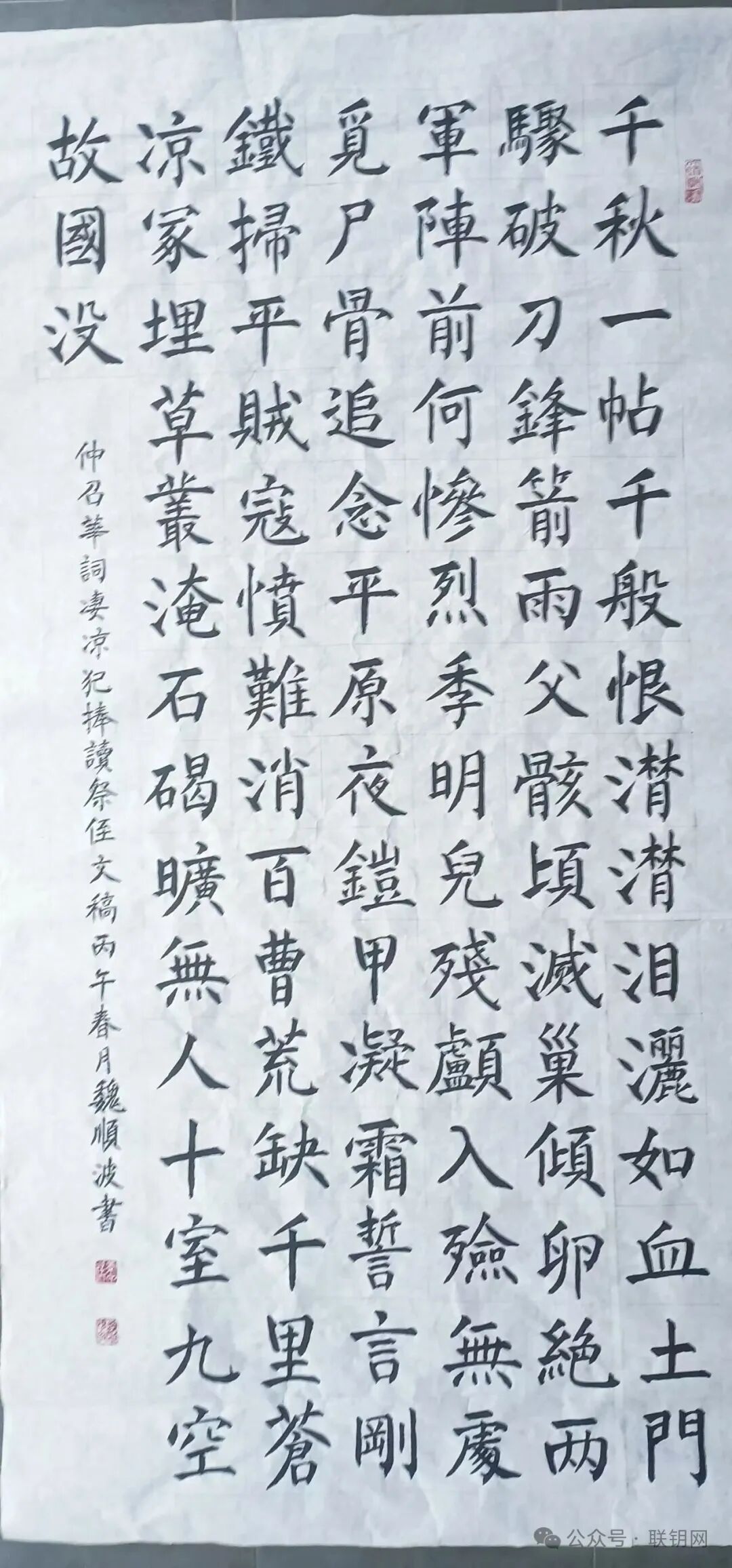 点评:词作层层递进,情感起伏,张弛有度。上阕聚焦“捧读”的当下感受,从“墨痕杂驳”的视角触动,到“横斜暗锁离索“的细节共情,再到斗豺狼、慷慨激昂,父子战顽恶”精神升华,对应文稿中“抚念摧切,震悼心颜”的情绪爆发;下阕转入今昔对比:以“叔侄同欢,笑谈犹乐”的温馨过往反衬当下惨烈,以“痛写哀章,待征雁来时寄托”联结哀思与家国情怀,最终落脚于“万古铎”的精神传承,恰似文稿从“追叙史实”到“宣泄悲情”再到“沉郁收束“的情感曲线,实现了词于原作在情绪节奏上的同频共振。
