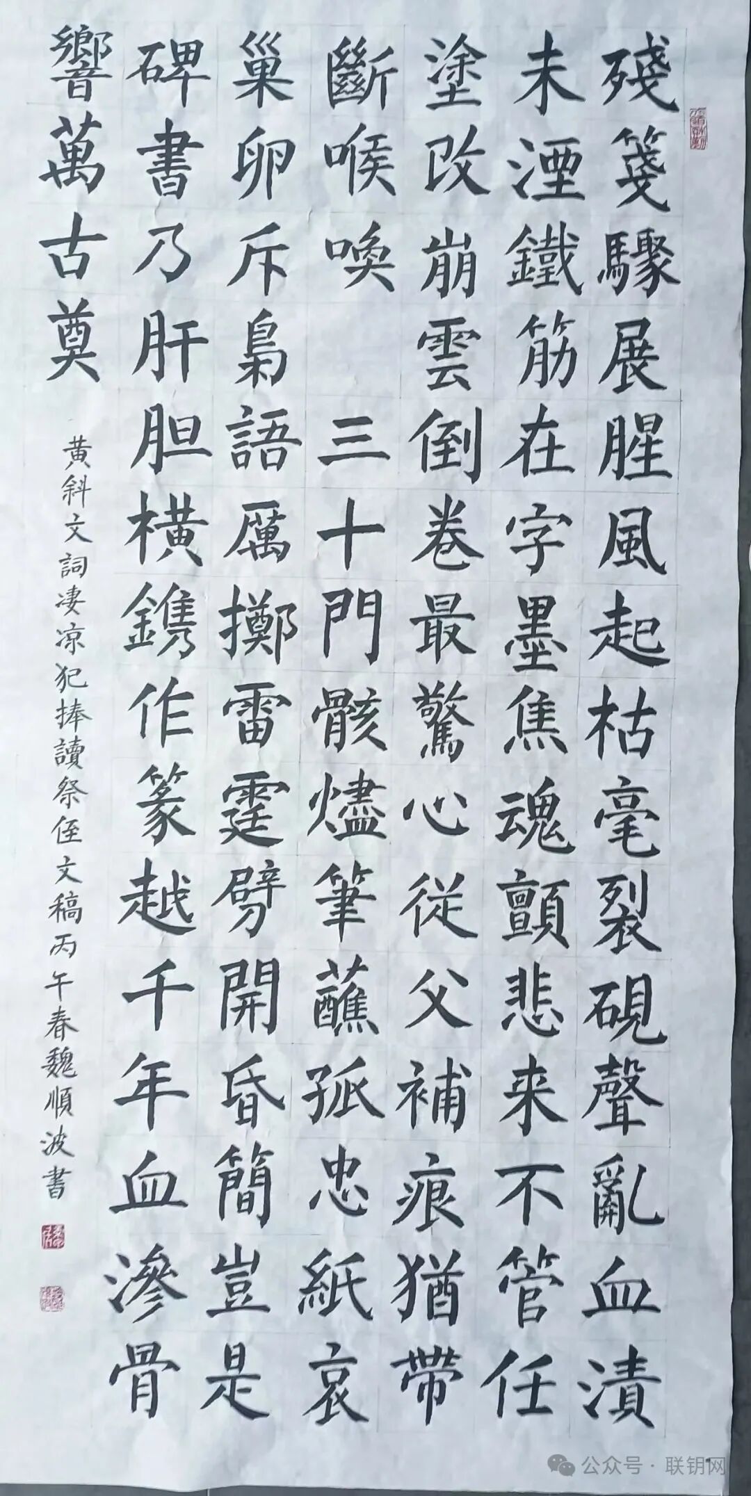 点评:词作善用历史意象营造悲壮氛围,上阕以“常山、鼓角”等意象还原颜杲卿父子死守孤城的残烈,下阕则以“纸短情长,把千古乾坤痛绝”反衬家国之恨的绵延不绝,对应文稿中“天不悔祸,谁为荼毒”的无力控诉。尤其“捧遗篇、气倾恨海、意未竭”之句,既点出读者捧读文稿时的共情,也张显了颜真卿书写时“悲愤难抑,意犹未尽”的状态,使词作与文稿实现情感上的跨时空对话。