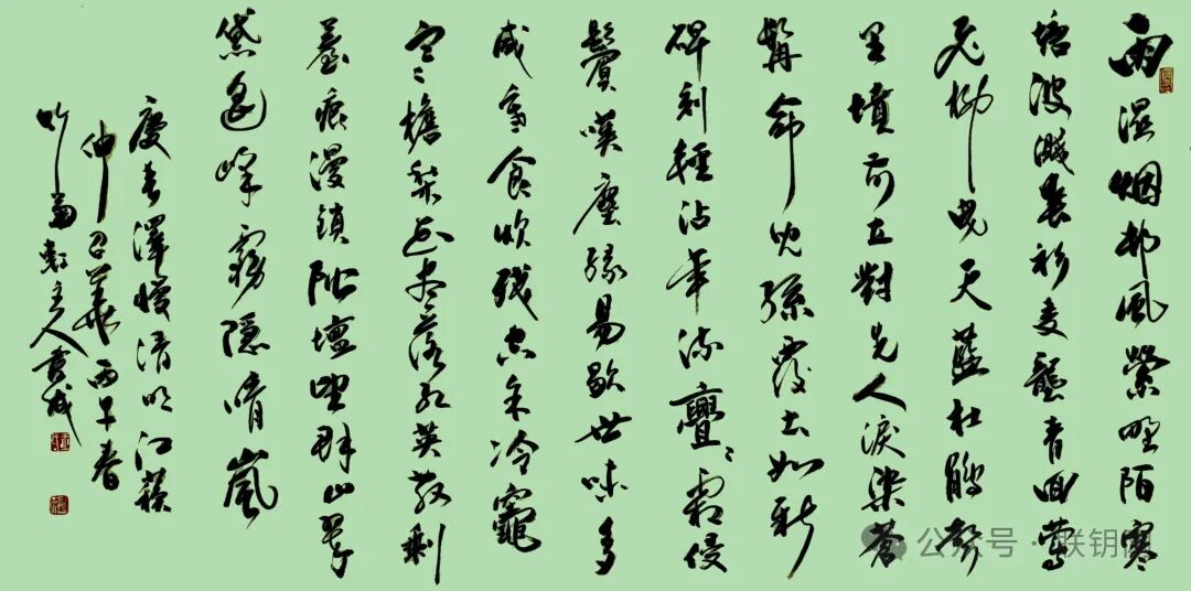 点评:以春日烟柳起笔,将游子乡思与家国情怀层层铺展。“牧笛一曲斜阳里”绘就田园清景,“万缕乡魂”直抒游子愁绪,未句“念英雄、旷世深思”更将个人追思升华为对民族精神的礼赞。全词意象流转自然,情感由浅入深,既有“鲜花一束真情寄”的细腻,亦有“日月同辉,不朽精神”的宏阔,堪称情与志的完美交融。