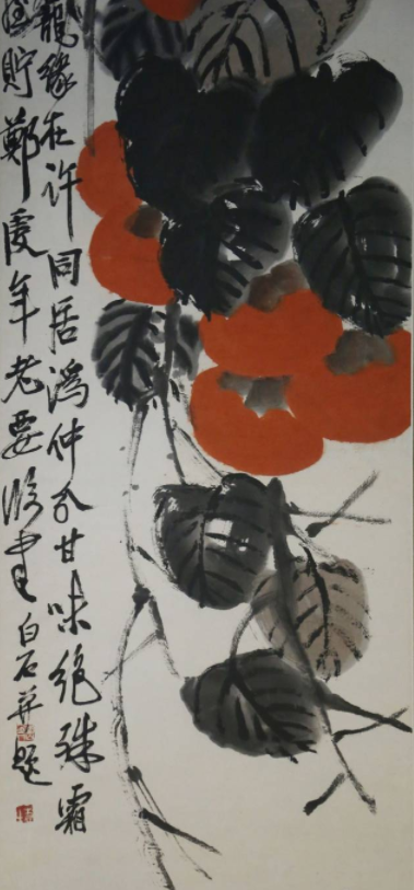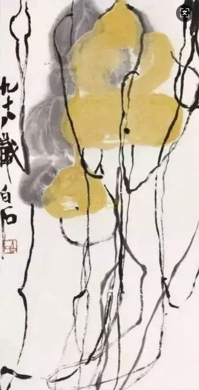 《葫芦》创作于1957年(93岁) 【题识】被认定为白石绝笔,白石老人去世后,中国文联、中国美协举办的白石遗作展上,经主办方及李可染、张仃、黄苗子等白石老人生前好友和学生的证明、认定,确定为白石老人生前最后的作品。
