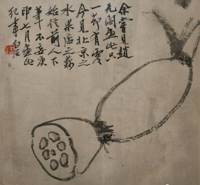《藕》创作于1920年(58岁) 【款识】余尝见赵无闷画此,只一节有零。今见北京之水果店之藕,始信前人下笔不妄。庚申七月画此记事。